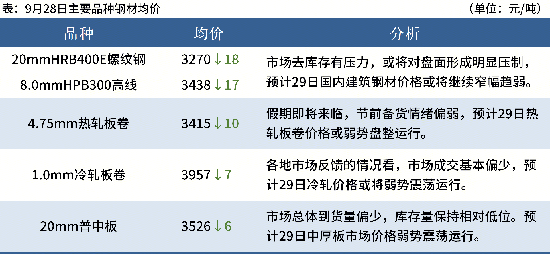 ◎ 9月28日,国内钢材市场弱势下跌,唐山迁安钢铁普方坯出厂含税价下调10报2970元/吨。