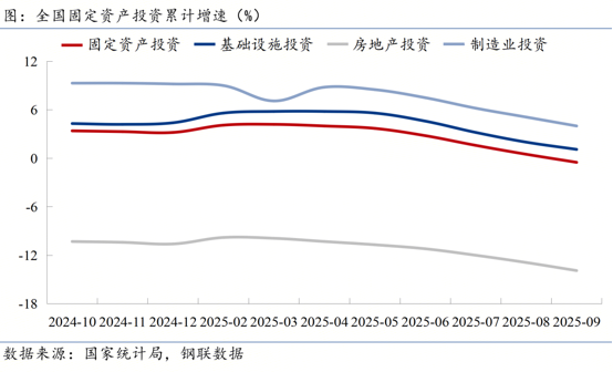 ◎ 1-9月,全国固定资产投资(不含农户)371535亿元,同比下降0.5%。分领域看,基础设施投资同比增长1.1%,涨幅较1-8月回落0.9个百分点。制造业投资增长4.0%,较前8个月回落1.1个百分点。房地产开发投资下降13.9%,降幅较1-8月扩大1.0个百分点。全国新建商品房销售面积65835万平方米,同比下降5.5%;新建商品房销售额63040亿元,下降7.9%。