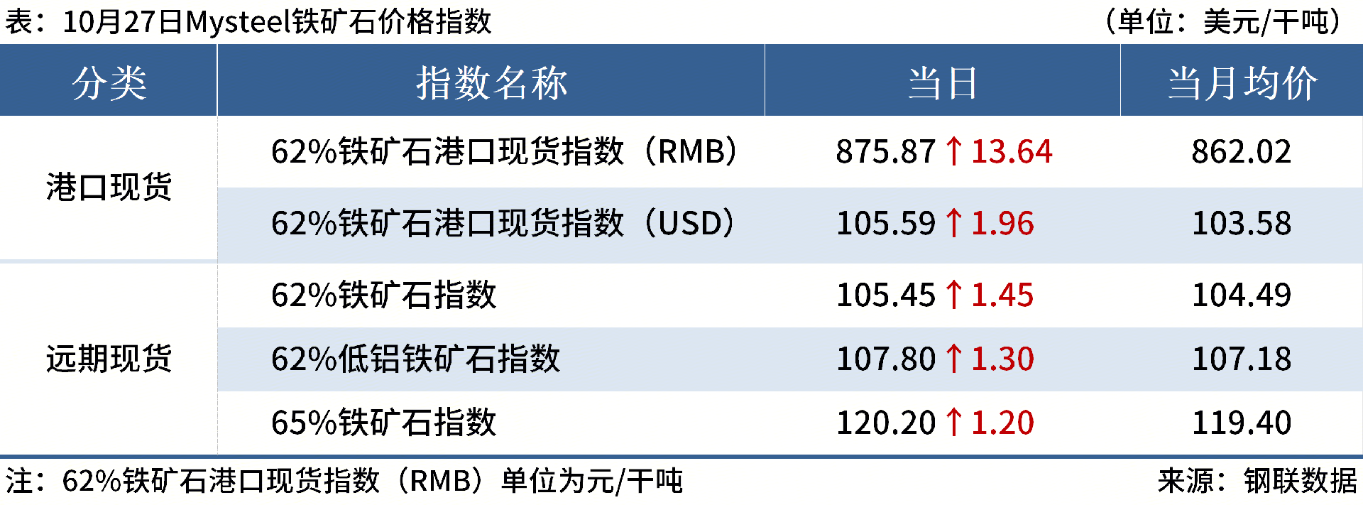 ◎ 10月27日,全国主港铁矿石成交73.00万吨,环比减9%;237家主流贸易商建筑钢材成交12.34万吨,环比增35.5%。
